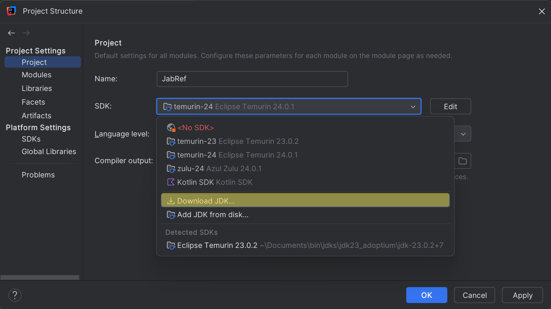 If you do not have the access to this JDK, download it by clicking on “Download JDK…” In the dialog that opens, select version 24, vendor “Eclipse Temurin (AdoptOpenJDK HotSpot)”, and click “Download”.
